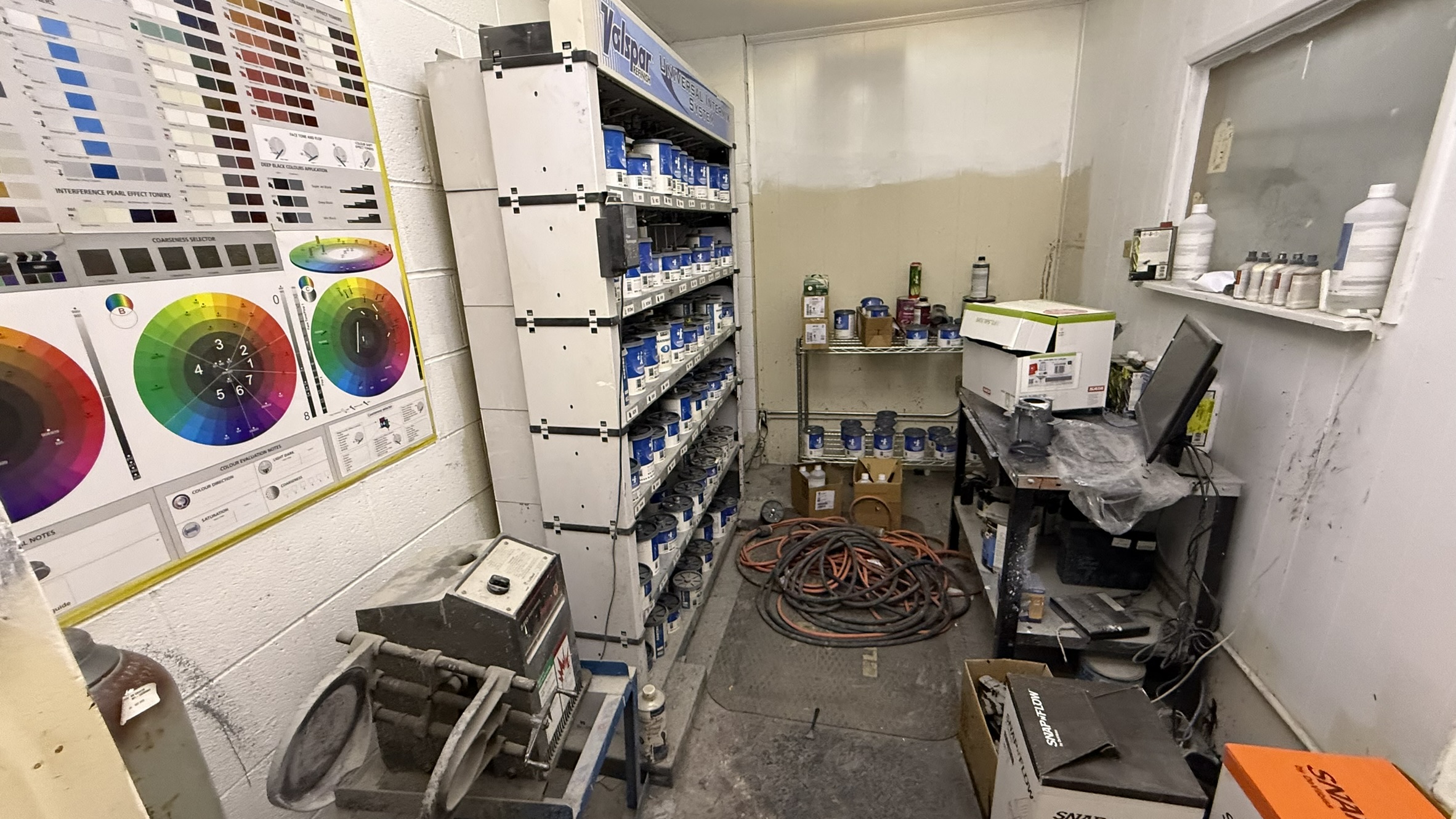 Abandoned Property - El Segundo Auto Spray & Body Shop Contents! This incredible auction features a complete Automotive Spray Paint & Body Repair Shop, including a Valspar Refinish Universal Intermix System with Fillon Base Quick-Mix 150 Plus Machine, SprayZone.net Crossfire Semi Down-Draft Spray Painting Booth, Chief EZ Liner 2 Frame Machine, Bend Pak Lift, Multiple Industrial Compressors, complete office contents and MORE!!