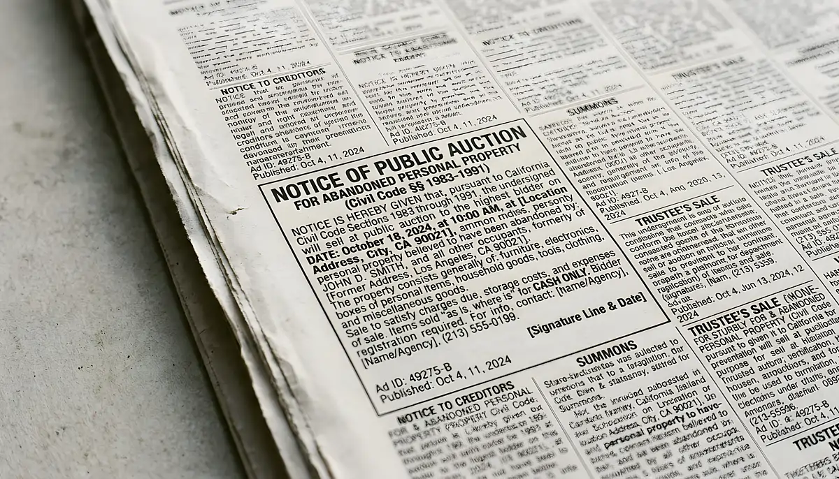 Once publication has been properly completed, the process can move forward to auction with a defined timeline and structure. A complete explanation of reclaim notice appears in Notice Of Right To Reclaim, and the sale process itself is addressed in When Abandoned Property Must Be Sold At Auction.